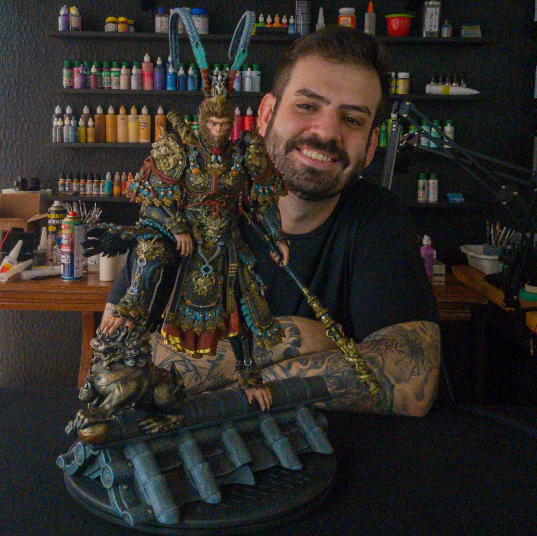 Criei o curso do Sun Wukong justamente para provar isso: você vai ver o passo a passo — do primer ao colecionável finalizado — utilizando materiais simples, sem abrir mão da qualidade e dos efeitos que fazem uma pintura se destacar.